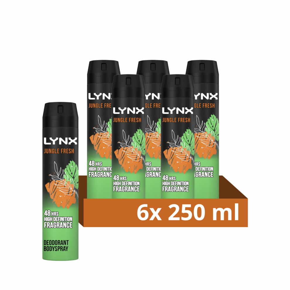 Lynx Jungle Fresh Aerosol Body Spray Men's Deodorant Spray with a palm leaves & amber scent for 48 hours of odour-busting zinc tech 6x 250 ml