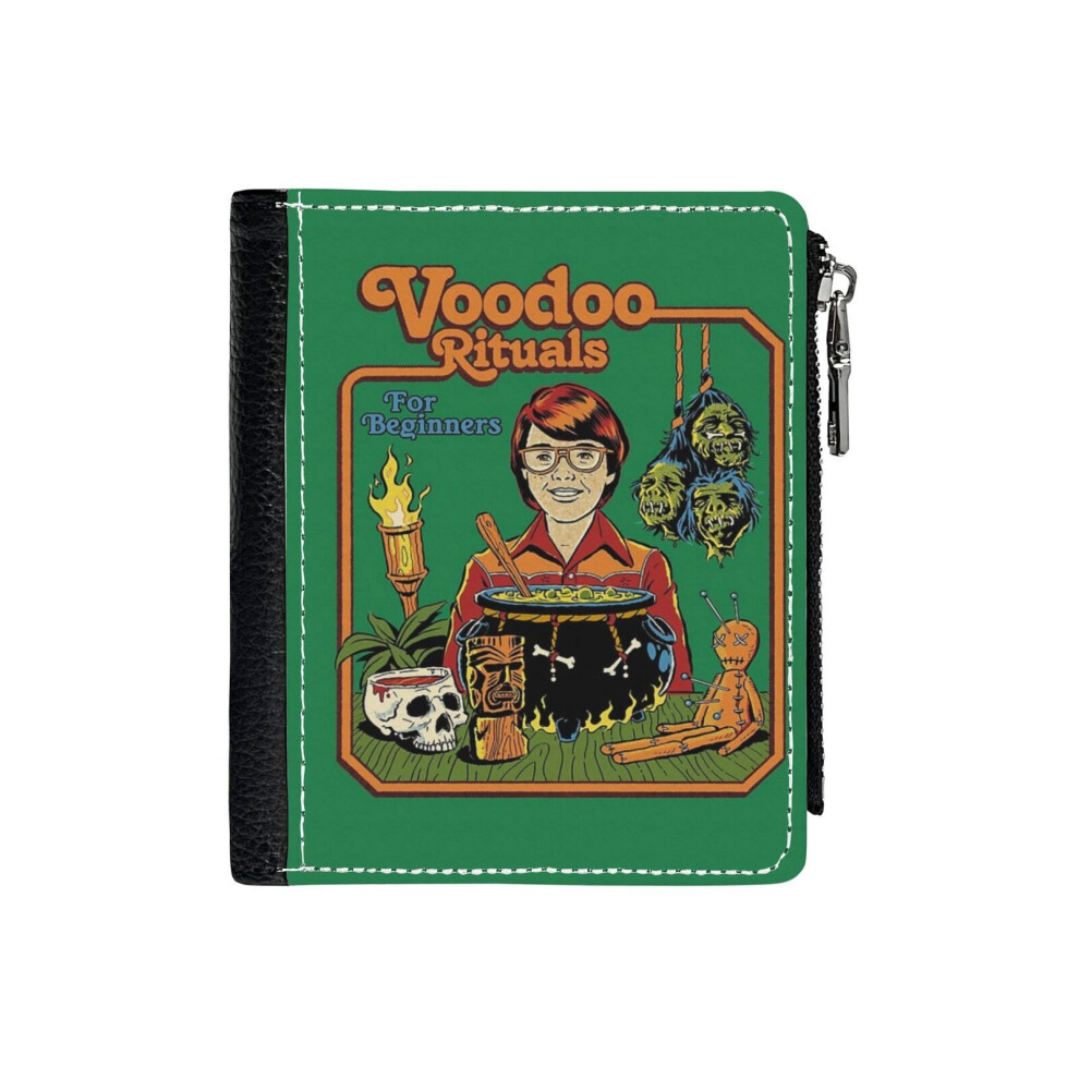 (Voodoo Rituals For Beginners_109) PU Wallet Compact Bifold with Zipper & Multiple Card Coins Slots Black Stylish Durable Graphic Design Print for Men