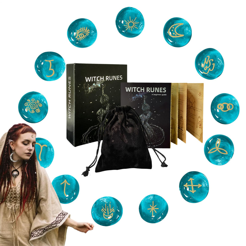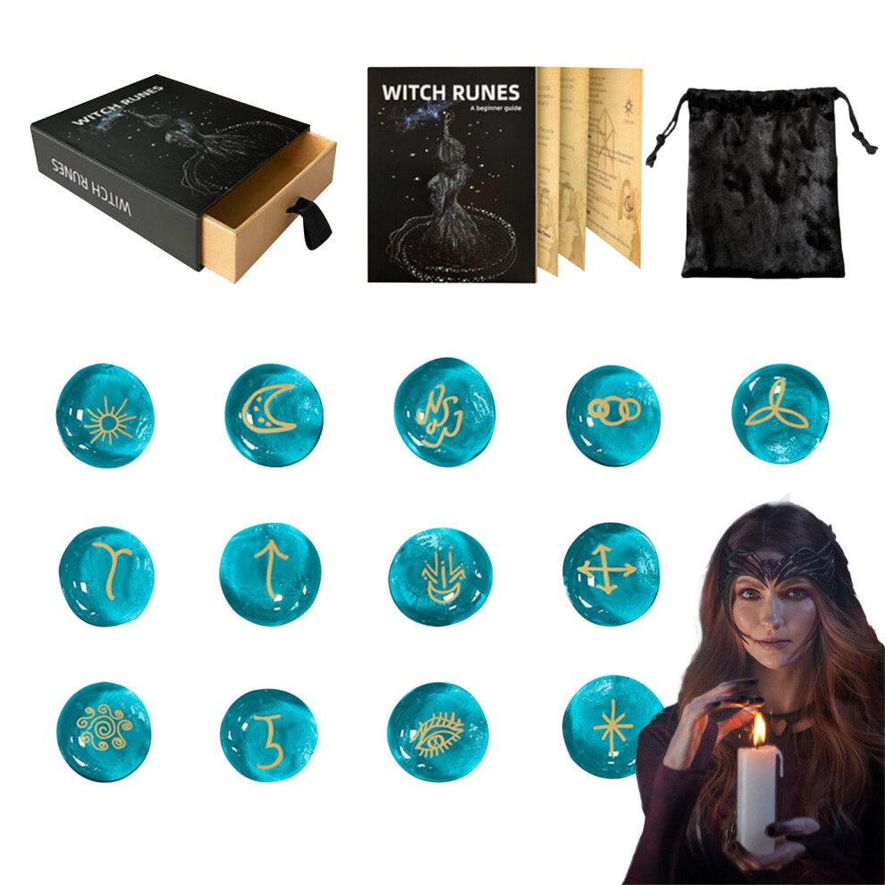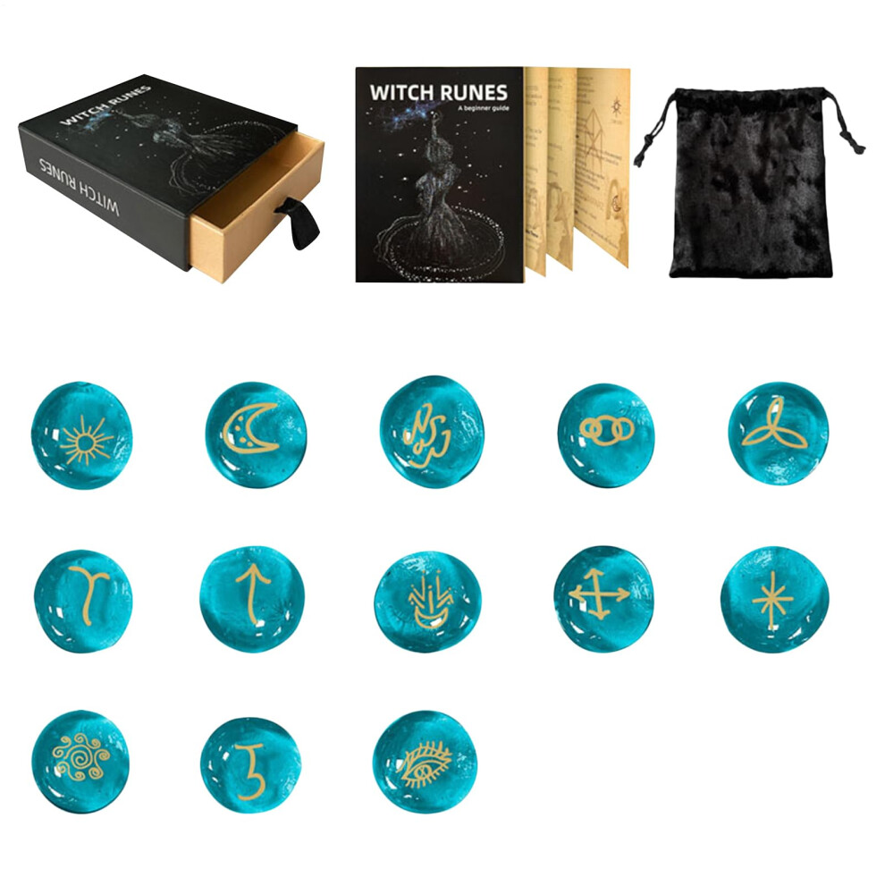 Runes Set - Divination Stones, Spiritual Ornament Tools | 13-Piece Glass Rune Set with Carved Symbols, Guide Book, and Storage Bag for Women, Men, Altar Rituals, Pagan Practices, Meditation, Mystical