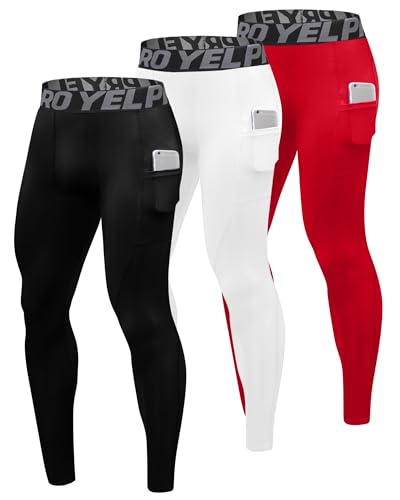 Yuerlian White Red Men's Running Tights Leggings 3 Pack Compression Athletic Workout Base Layer Trousers Breathable Sports Gym Yoga Walking Pants with Pockets