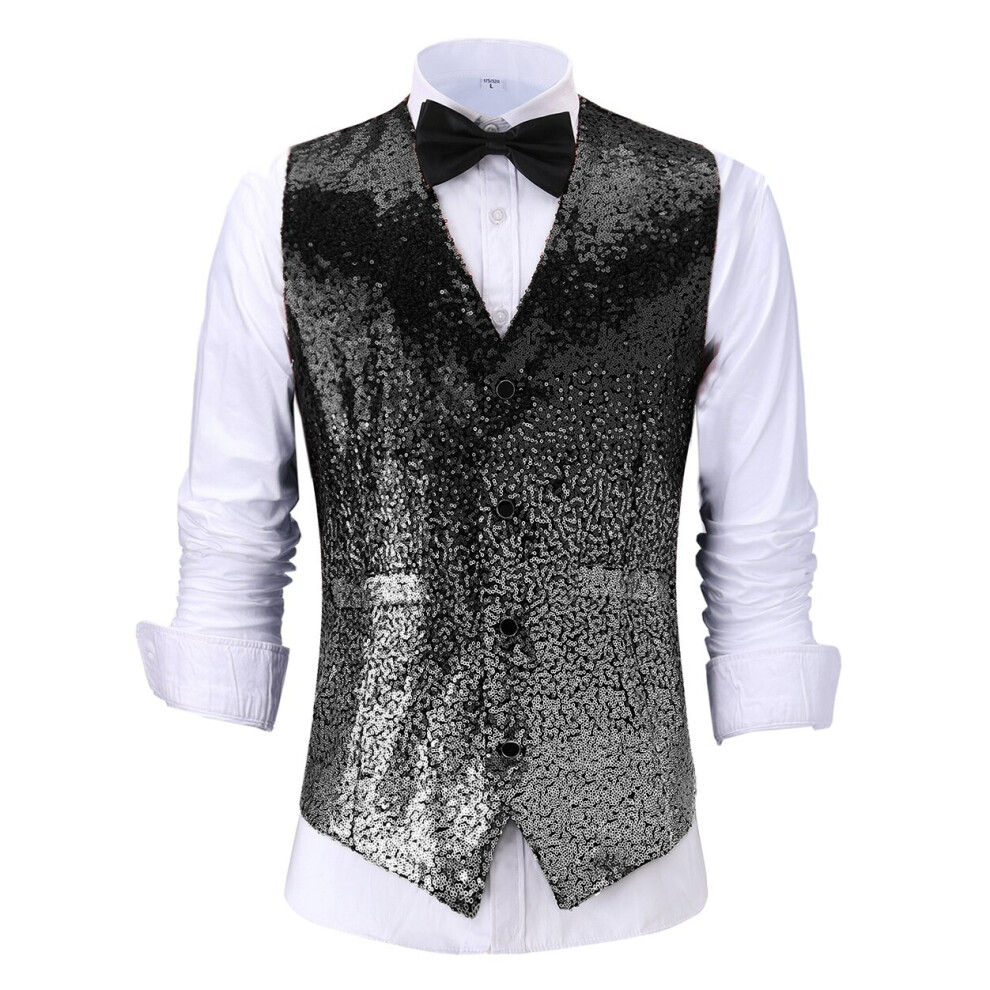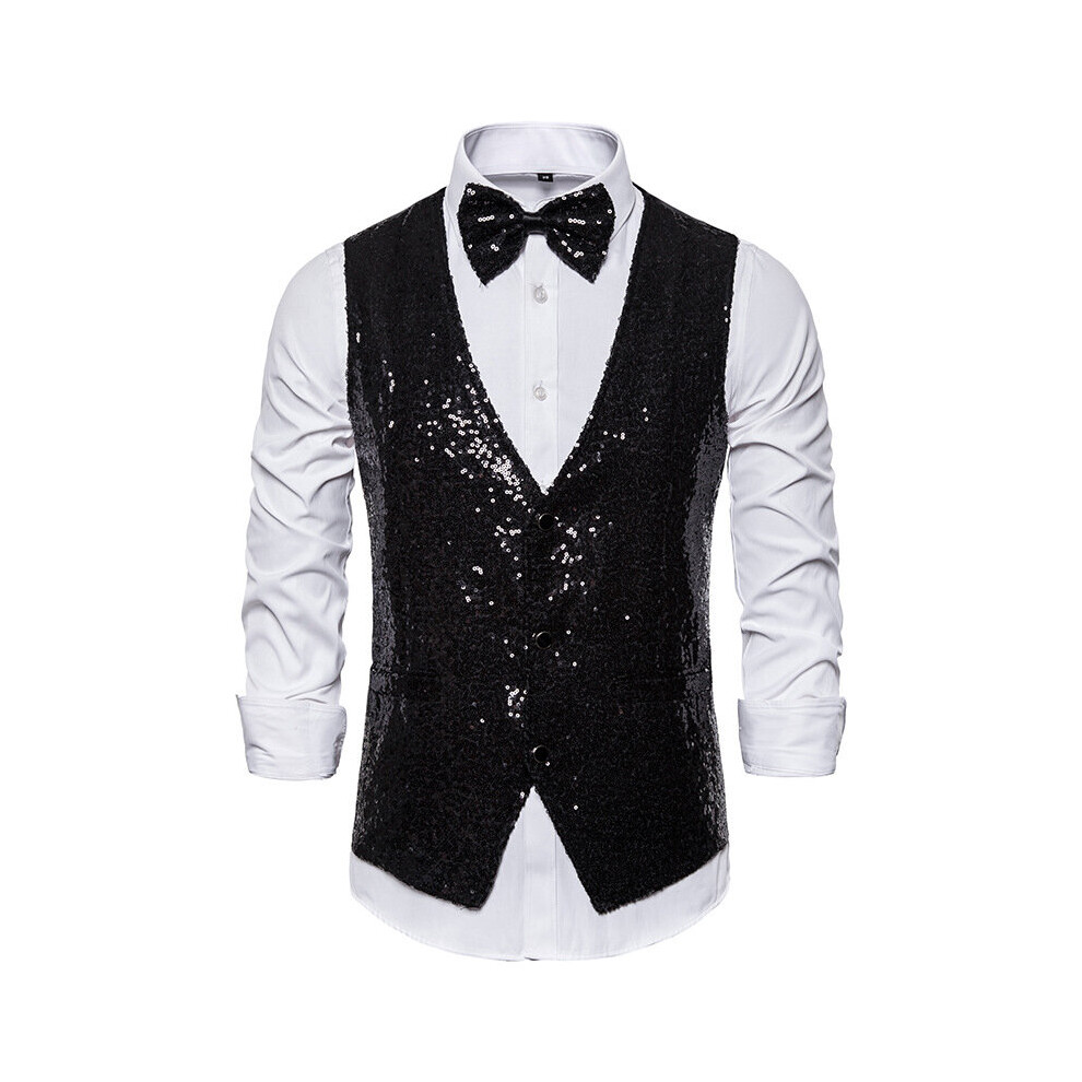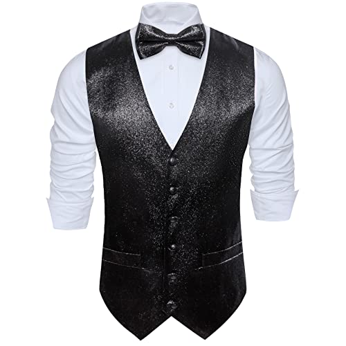 Barry.Wang Mens Sequin Shiny Black Waistcoat Bowtie Set Sparkly Casual Suit Vest Festival Disco Party Prom