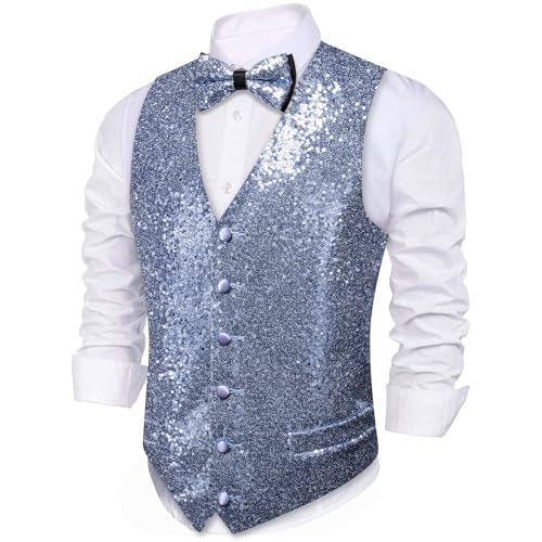 Barry.Wang Mens Sequin Shiny Silver Waistcoat Bowtie Set Casual/Leisure V-neck Slim Fit Suit Vest for Festival Party Prom 2PCS