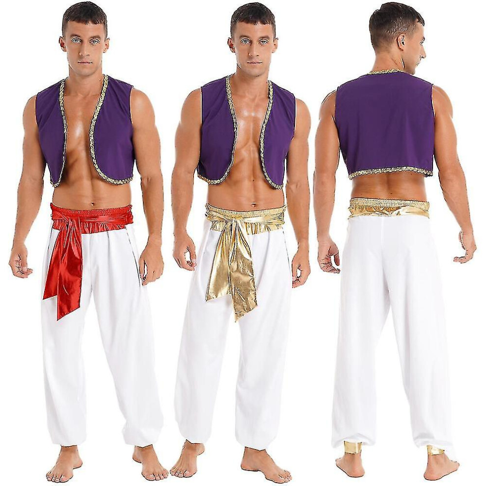 (XL, Gold A) Mens Halloween Costume Mythical Prince Aladin Carnival Carnival Cosplay Party Outfit Sequin Trim Waistcoat With Belted Pants