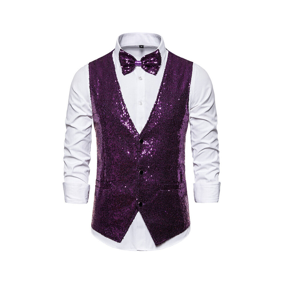 Sequin Sparkling Waistcoat Men Slim Fit V Neck 2 Pieces Mens Vest with Bowtie Wedding Party Stage Prom Costume Gilet