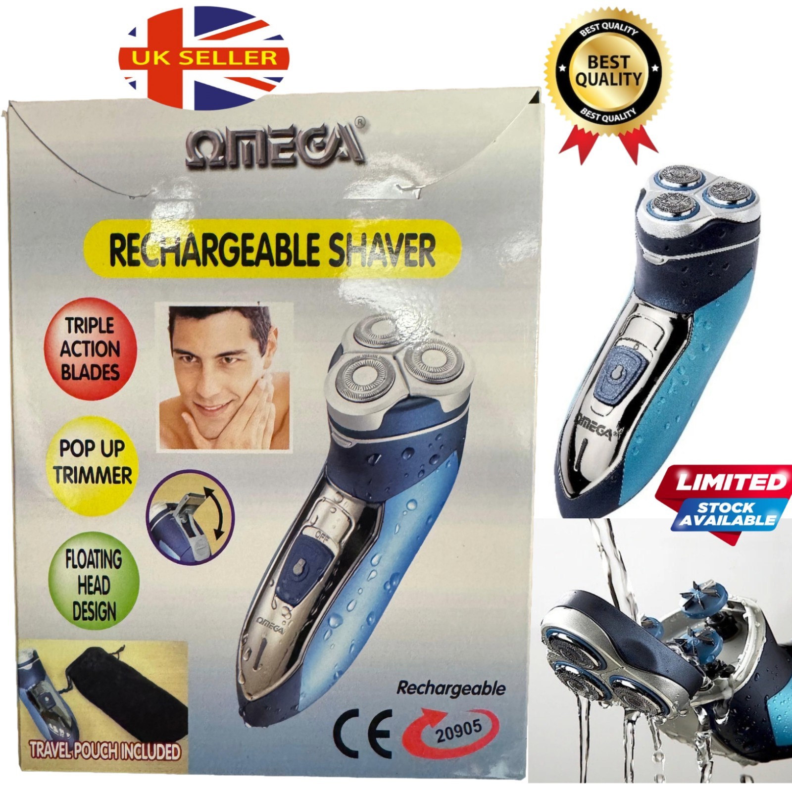 Omega 20905 Mens Electric Shaver Cordless Rechargeable 3 Head Washable