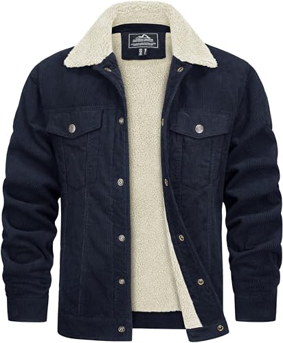TACVASEN Mens Corduroy Jacket Sherpa Fleece Lined Lumberjack Jacket Winter Warm Casual Trucker Cargo Coat for Work Fishing Navy, S