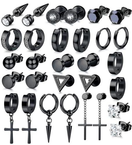 Adramata 24Pcs Mens Earrings Set - Stainless Steel Stud, Hoop, Dangle, Cross, Chain, Punk, Fashion Boys Earrings - Silver, Black for Men, Women