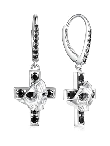 Mens Dangle Hoop Earrings Skeleton Cross Silver Halloween Black Moissanite Goth Cool Skull Earrings