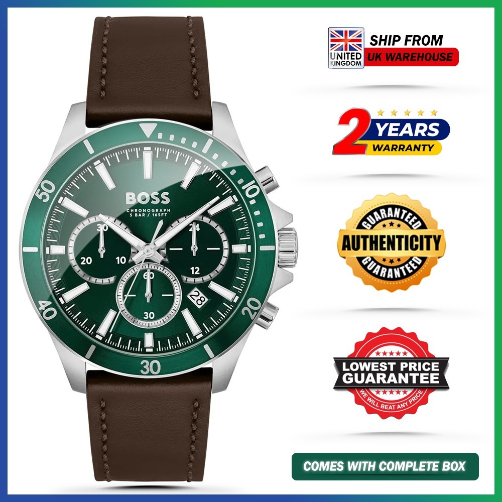New HUGO BOSS Troper HB1514098 Chrono Green Dial Brown Leather Strap Mens Watch