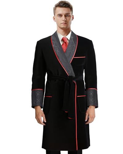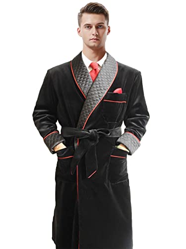 Apornipal Men's Long Velvet Smoking Jacket with Belt Shawl Lapel Smoking Robe Quilted Dressing Gown, Black, 44