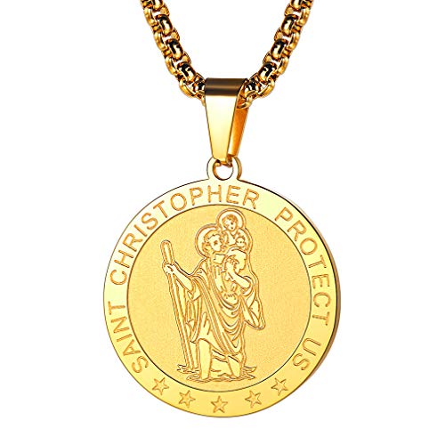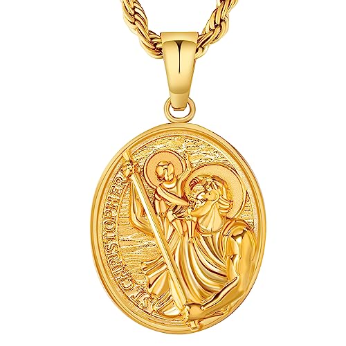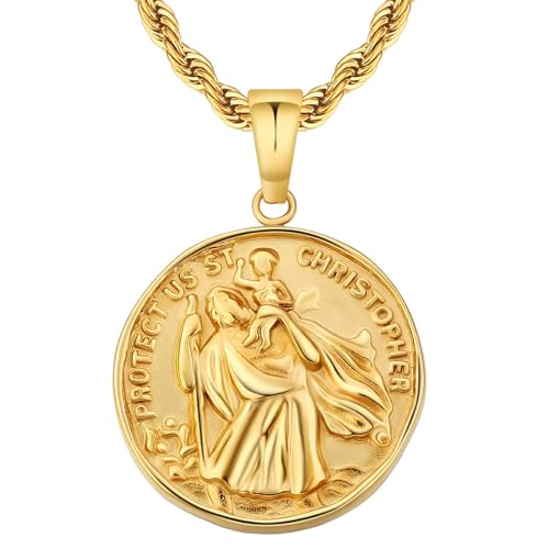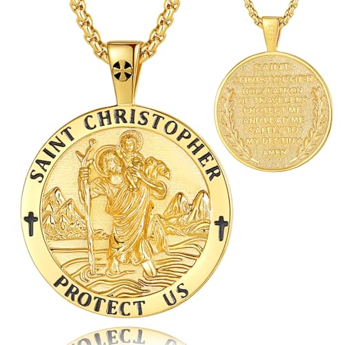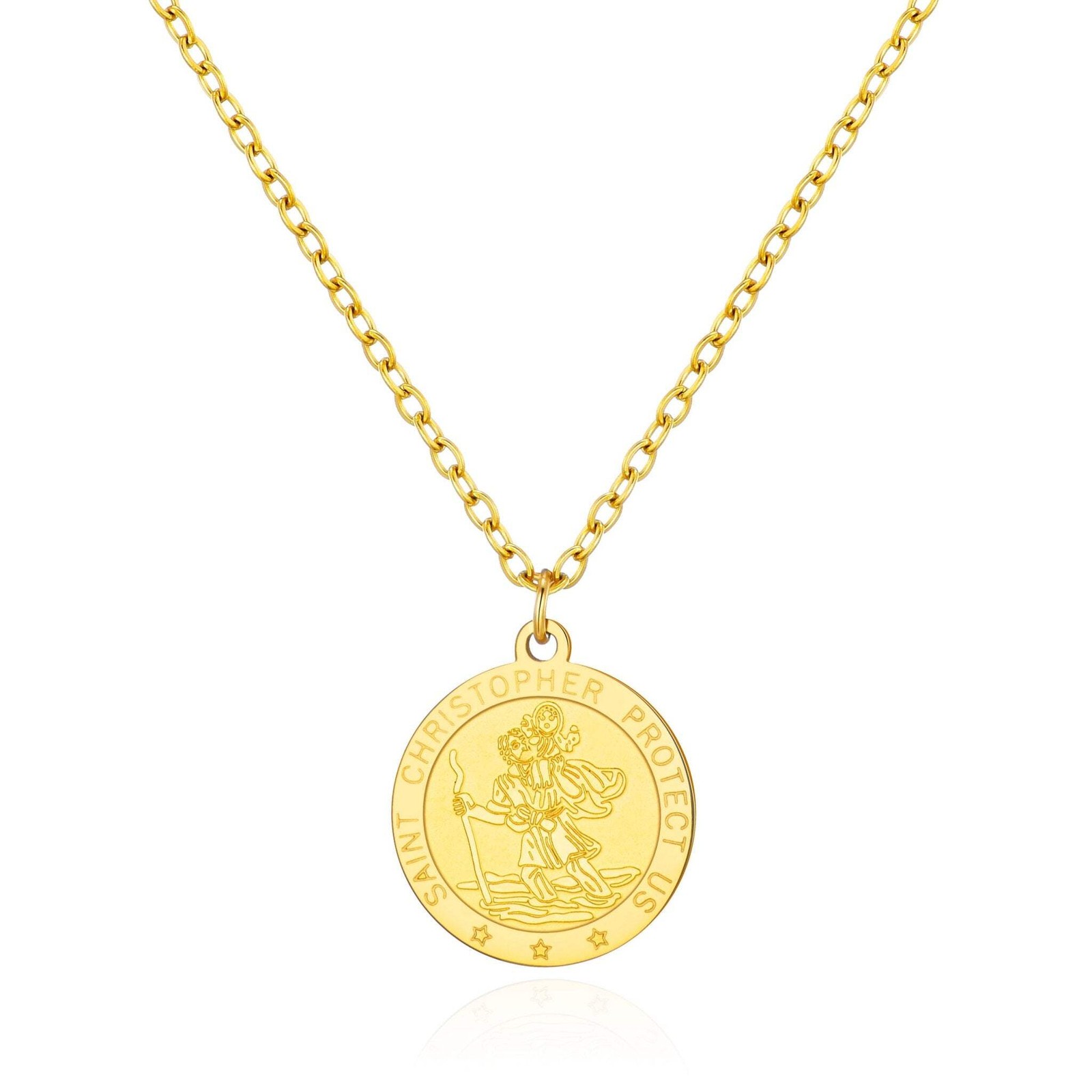 FaithHeart Gold St Christopher Necklace for Christening Talisman Jewellery Saint Christopher Cion Medal Stainless Steel Men Pendant Good Luck Charm Xmas Gift for Women Ladies