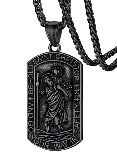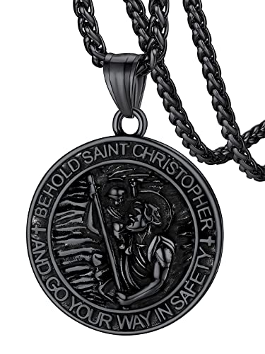 FaithHeart Men's Saint Christopher Necklace, Patron Saints Round Pendant St Christopher Jewelry Black, Stainless Steel Christian Neck Charm