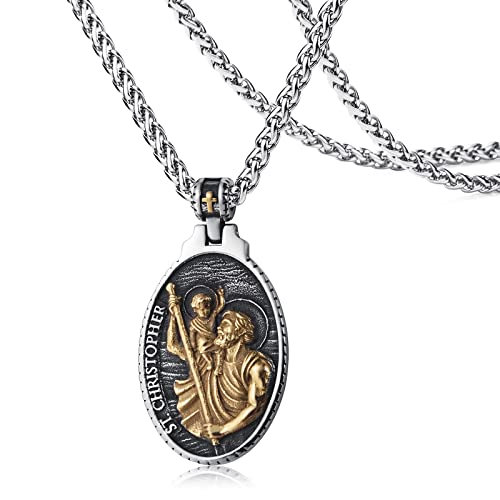 FaithHeart Men's St Christopher Pendant Necklace, Stainless Steel Saint Christopher Dog Tag Jewellery, Catholic Amulet Neck Chain 22"+2" inches