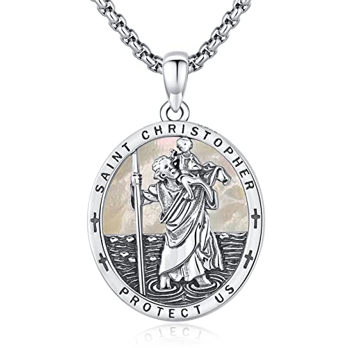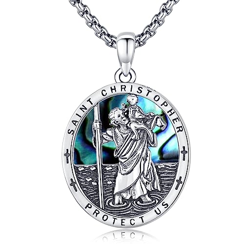 SOESON St Christopher Necklace for Men, St Christopher/Jesus Necklace 925 Sterling Silver Antiqued Religious Pendant Men Necklaces Talisman Jewellery Gift (Abalone)