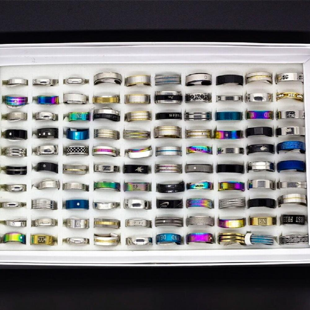 100pcs/Lot Mens Womens Stainless Steel Rings Polished Laser Cut Patterns Jewelry Mix Styles