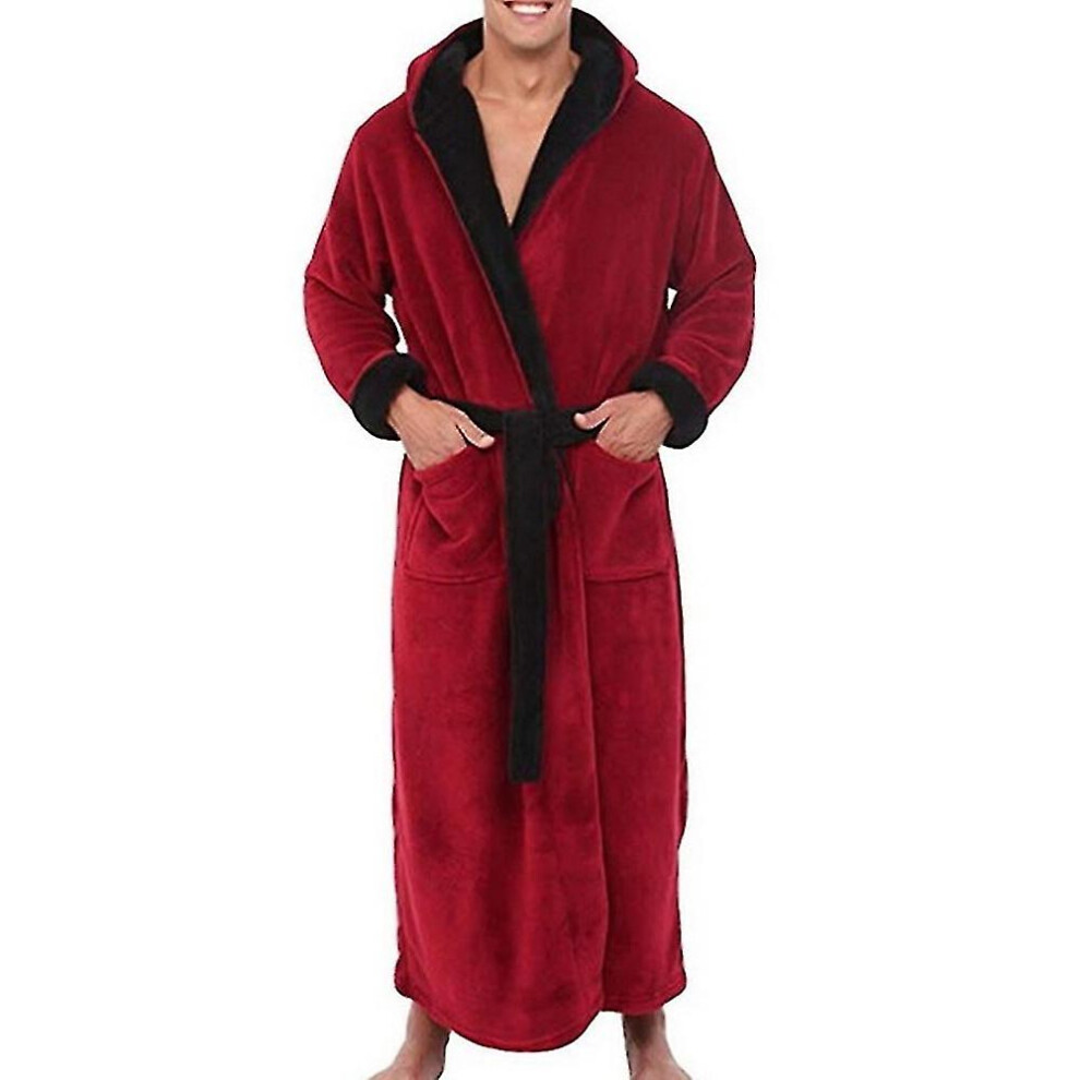 (Red Black, XL) Mens Winter Warm Hooded Coat Bathrobe Towelling Long Dressing Gown