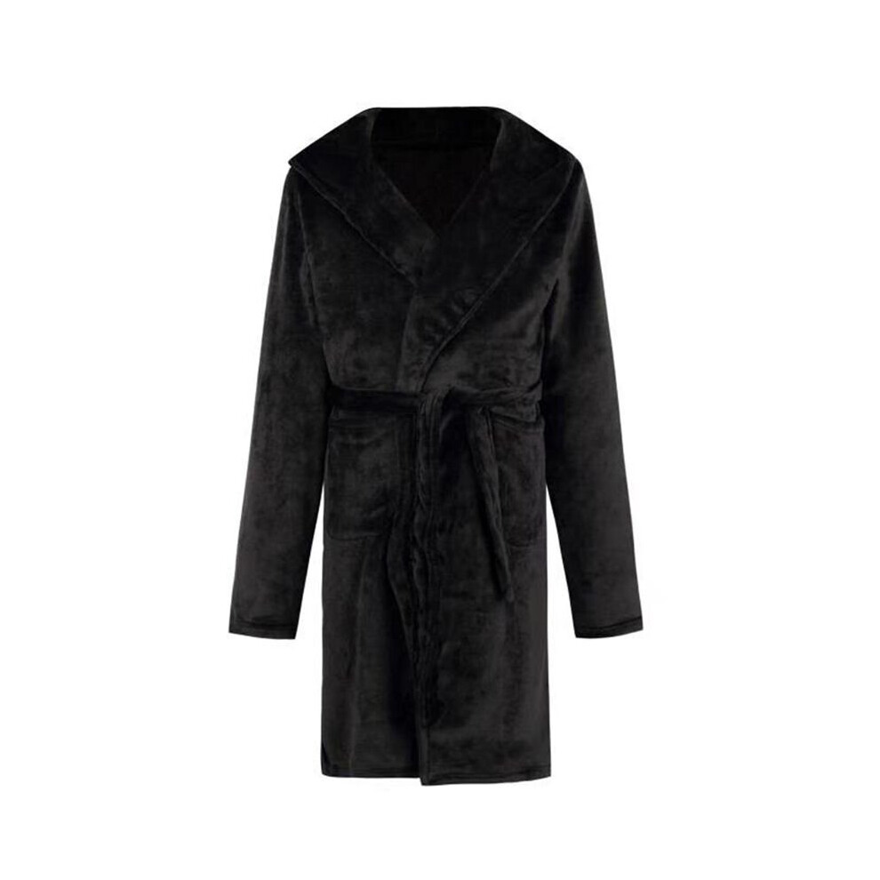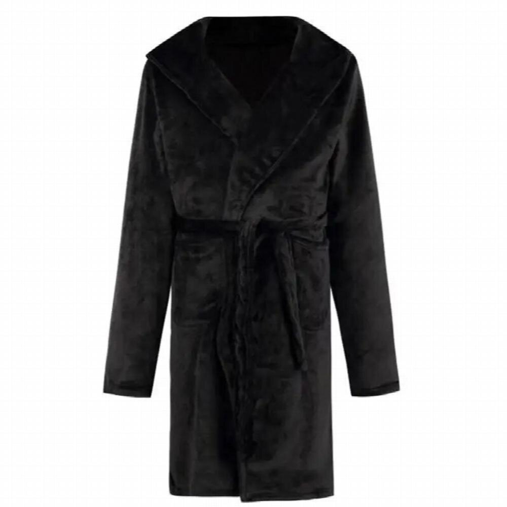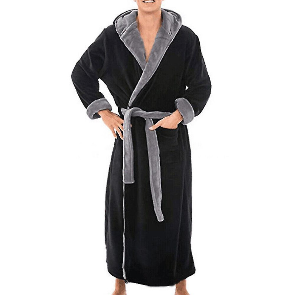 (Black Grey, M) Mens Winter Warm Hooded Coat Bathrobe Towelling Long Dressing Gown