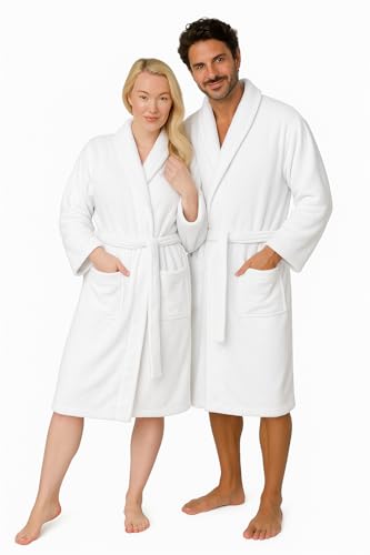 Dressing Gown for Women & Men 2 Pack | Towelling Bathrobe for Adults with Belt, Pockets & Shawl Collar | Women's Dry Robes & Men’s Nightwear | 100% Cotton, Warm, Soft & Cozy Loungewear (White-L/XL)