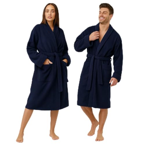 Dressing Gown for Women & Men 2 Pack | Towelling Bathrobe for Adults with Belt, Pockets & Shawl Collar | Women's Dry Robes & Men’s Nightwear | 100% Cotton, Warm, Soft & Cozy Loungewear (Navy-S/M)