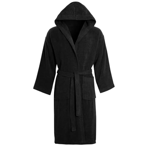100% Egyptian Cotton Terry Towelling Hooded Bathrobe Men's and Ladies Unisex Dressing Gown Spa Gym Bath Towel (Black, Small/Medium)