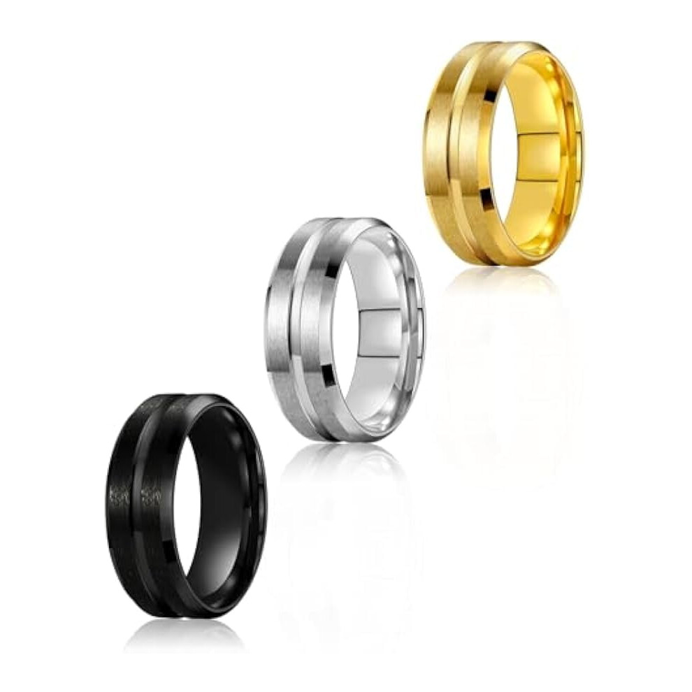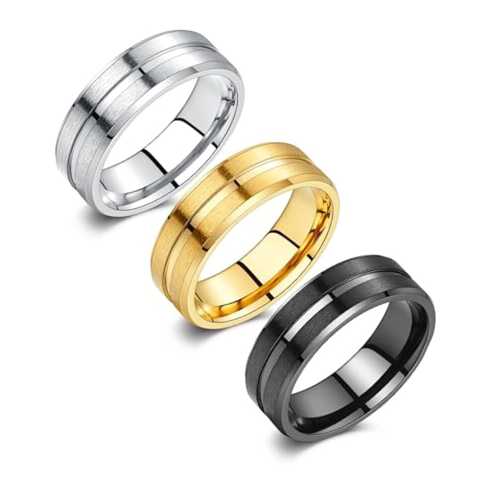 3PCS Stainless Steel Men's Rings, 8mm Black & Gold Plated Wedding Band Set, Grooved Matte Brushed Finish, Comfort Fit 7-12