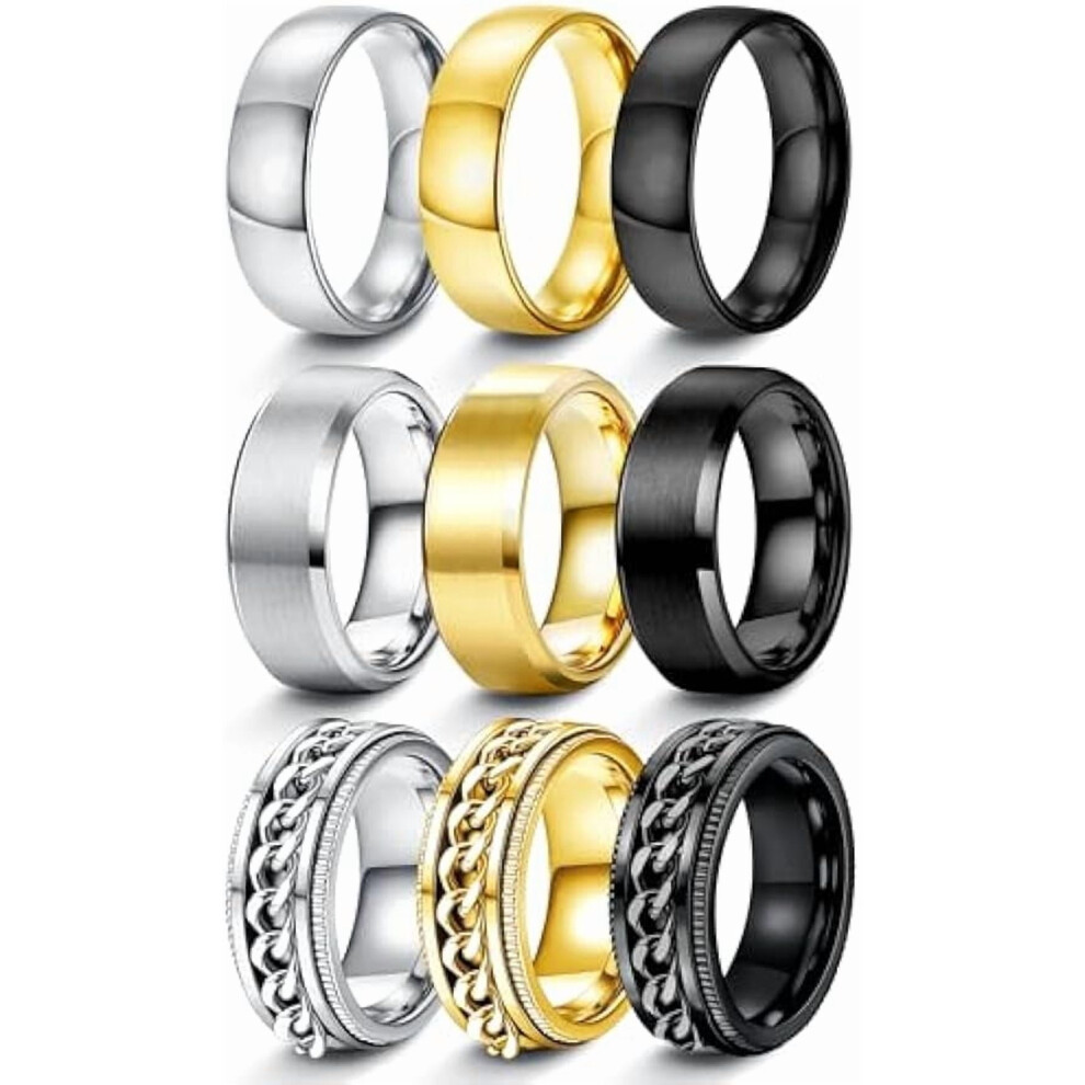 9Pcs Men's Stainless Steel Rings Set (Gold/Silver/Black), 8mm Width, Size 7-12, Compatible with Wedding & Promise Bands