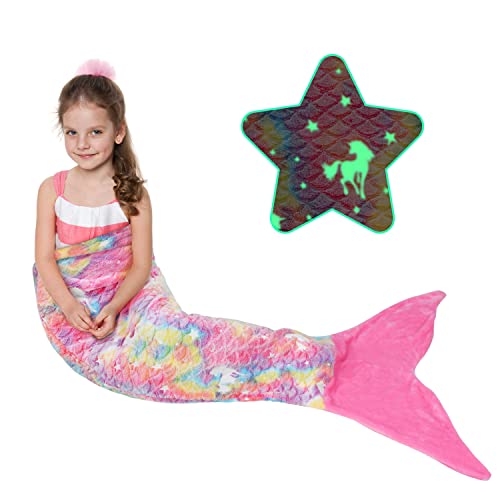 JOINPAYA Glow Dark Luminous Mermaid Tail Blanket for Soft Plush Wearable with Unicorn Pattern Lightweight Travel Throw for Machine Washable