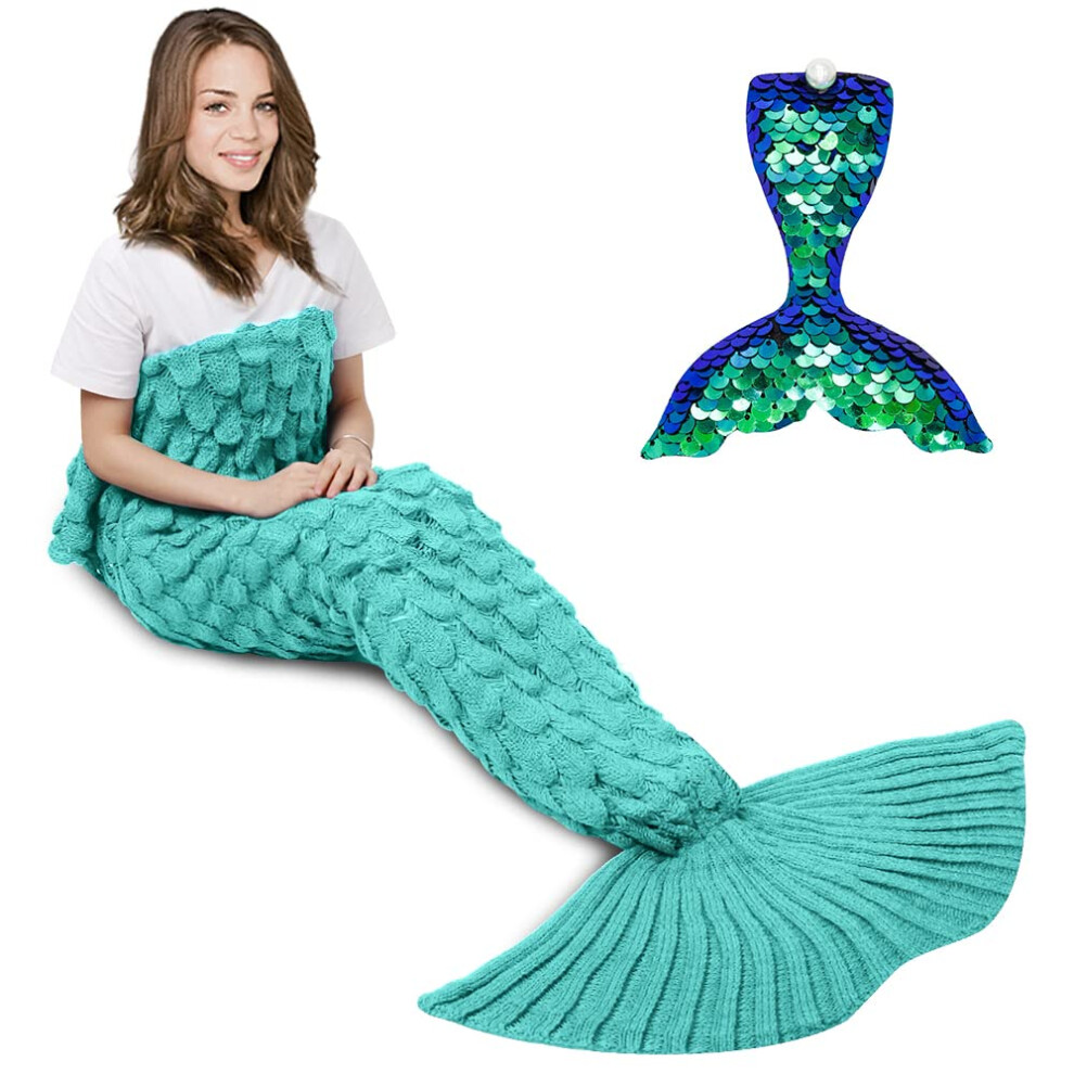 AmyHomie Mermaid Tail Blanket for Adults, Crochet Mermaid Blanket for Women Soft All Seasons Sleeping Blankets Gift for Teen Girls (ScaleMint,Adults)