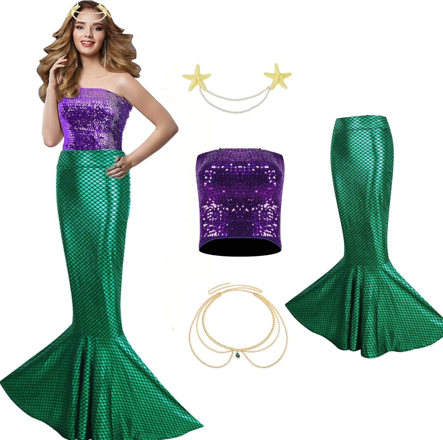 AYYOHON Mermaid Costume for Women, 4PCS Mermaid Outfit Sequin Tube Top Skirt Pearl Waist Head Chain for Halloween Cosplay L