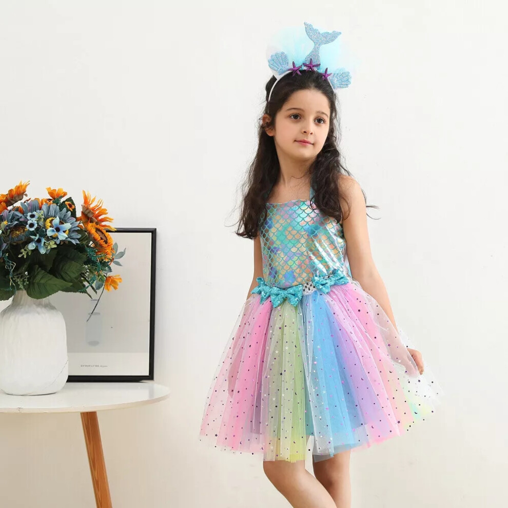 HenzWorld Mermaid Costume for Little Girls Princess Party Dress Birthday Outfit Mermaid Gift Cosplay Role Play Halloween Sleeveless Headband 4t Kids