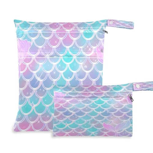 Waassud Dreamy Mermaid Scales Wet Dry Bag Reusable Wet Bags Organizer Diaper Bag Organizing Pouches with 2 Zippered Pockets for Swimsuit Gym Clothes