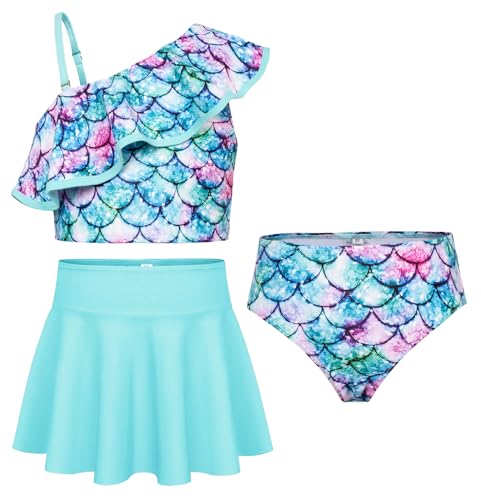 GRACE KARIN Girls Swimsuit 3pcs Bikini Set with Skirt Kids Mermaid Swimsuit Ruffle Swimwear Blue Mermaid 10 Years