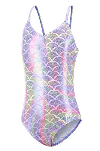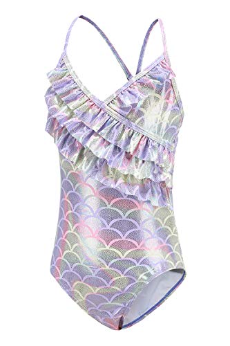 RAISEVERN Girls Swimming Costume Swimsuit Mermaid Funny Cute Purple Green Beachwear 3D Round Neck Sleeveless Swimming Wear, L, 7-8 Years