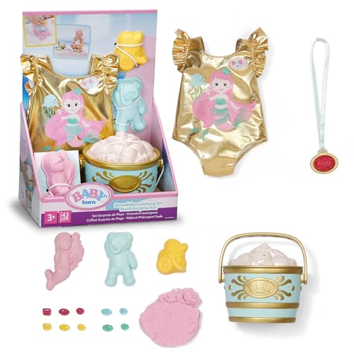 BABY born Beach Surprise Set with mermaid print swimsuit, sand molds, malleable sand, bucket and 5 surprises for 43cm dolls