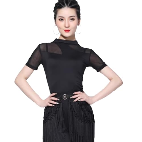 PONNYC Ballroom Dancewear Hollow Latin Dancing Basic Top for Women Cha Cha T Shirt Body Suit Tops Mesh Splice Tango Costumes,Black,M