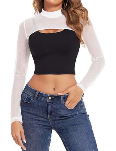 Avidlove Mesh Crop Tops for Women Mock Neck Long Sleeve Crop Top See Through Shirt Top Sexy Clubwear White