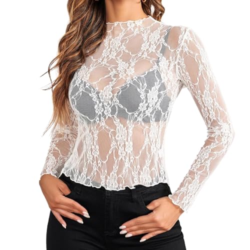IECCP Mesh Tops for Women Elegant See Through Lace Top Long Sleeve Mesh Sheer Tight Lace Top for Party Going Out Spring Summer Festival Outfit White L
