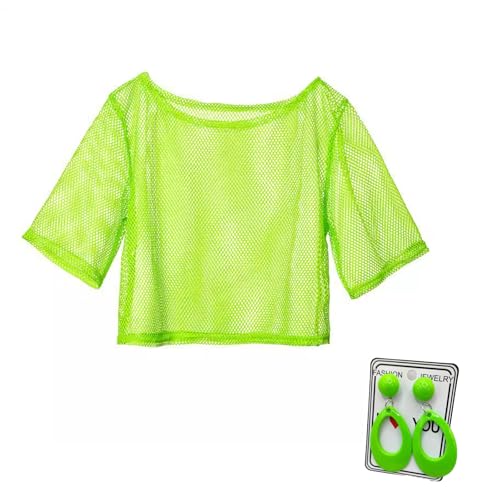 Neyeau 80s Neon Fishnet Mesh T-Shirt, Green Mesh Tops for Women, Neon Party Clothes, Fishnet Top, Suitable for 1980s Retro Theme Party, Masquerade, Club Wear, with 1 Pair of Water Drop Earrings