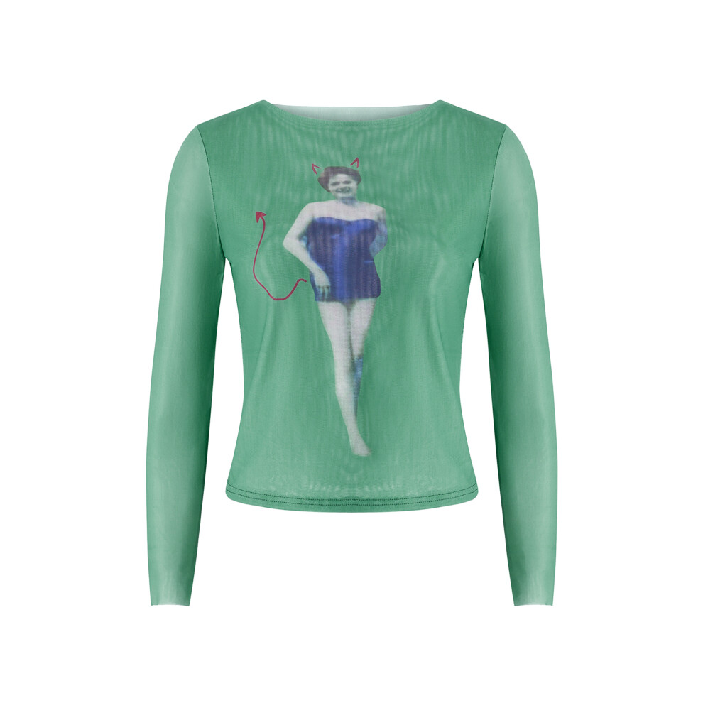 (M, Green) Ladies Summer Autumn Mesh Tops, Women Leisure Style People Printing Long Sleeve Round Collar Slim T-shirt Base Shirt