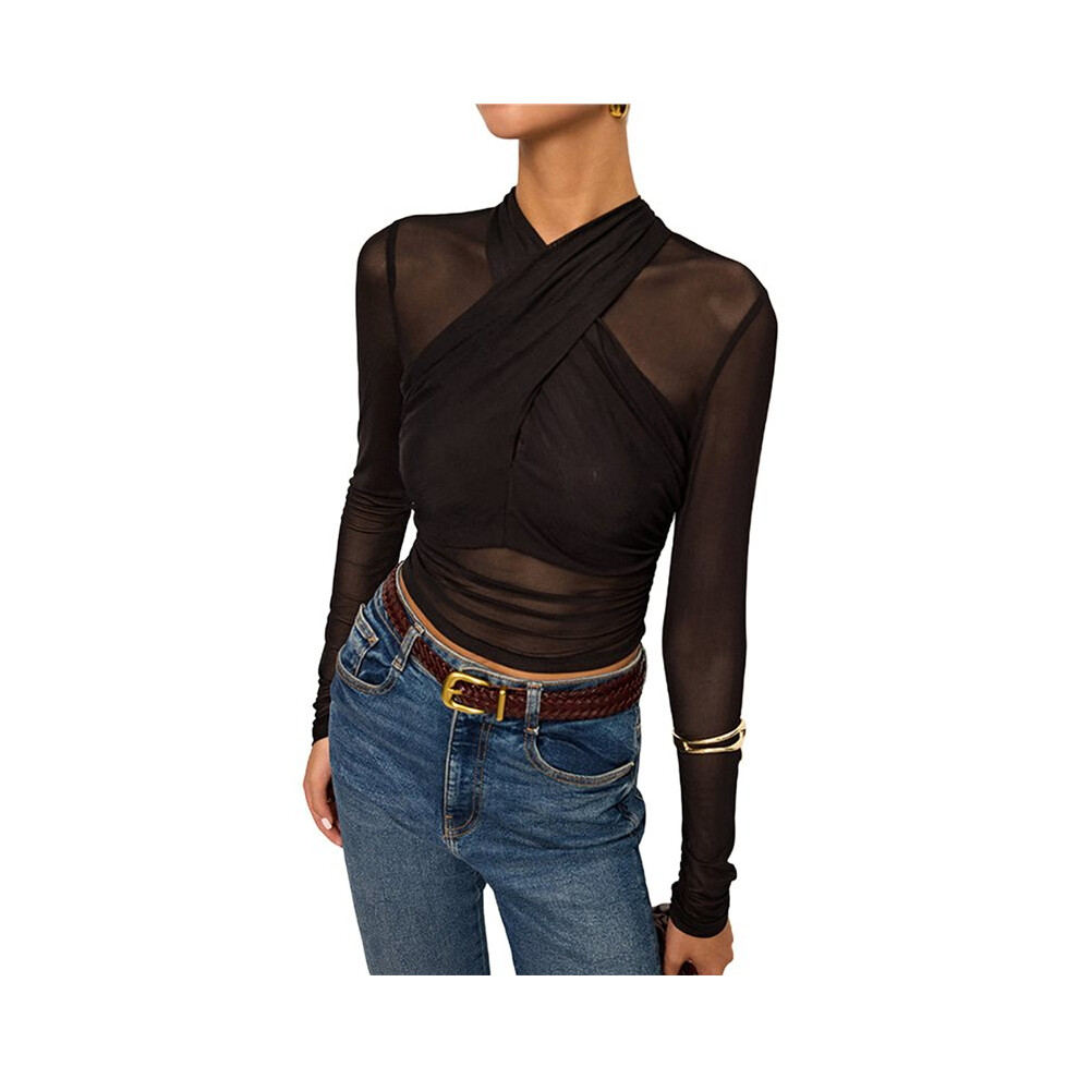 Long Sleeve Mesh Crop Tops for Women Criss See Through Sheer Ruched Blouse Slim Fit Tee Shirt Black S