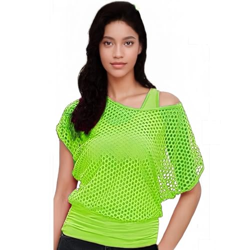 TouKingda 80s Mesh Fishnet Tops Vest for Women Fishnet Off Shoulder T-Shirt Tank Top Fancy Dress Fishnet Ladies Disco Retro Outfit 1980s Costume Neon Green/L