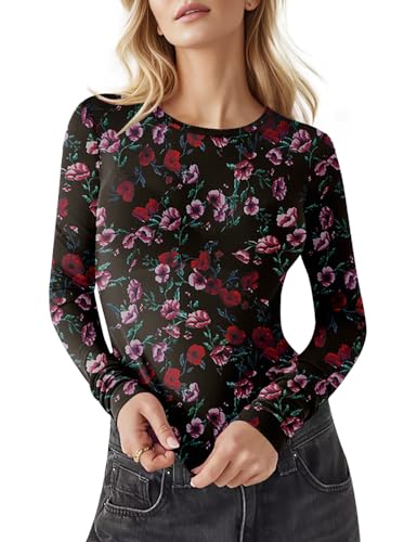 IECCP Mesh Tops for Women See Through Tight Sheer T-Shirt Slim Fit Y2K Crop Tops for Party Club Black with Pink Flowers L
