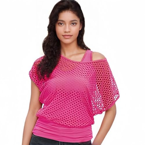 TouKingda 80s Mesh Fishnet Tops Vest for Women Fishnet Off Shoulder T-Shirt Tank Top Fancy Dress Ladies Disco Retro Outfit 1980s Costume Neon Pink/L