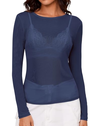 IECCP Women Mesh Tops Sexy Long Sleeve T-Shirt Mesh Lace Tops for Women UK Party Club Night Blouse Navy Blue S