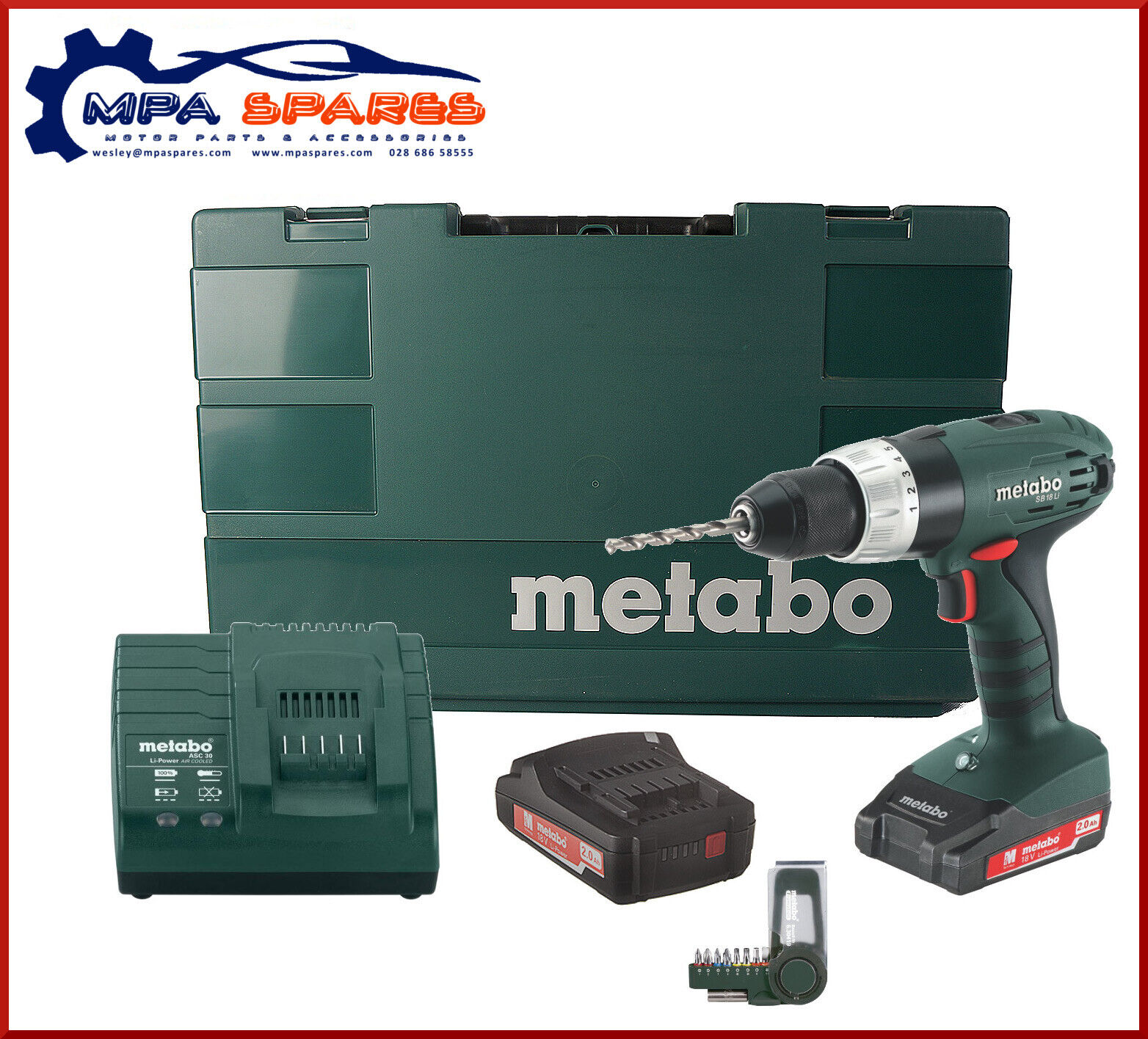 METABO SB18LI 18V COMBI DRILL, 2 x 2Ah Li BATTERIES,CHARGER,BITS,CASE 602190510