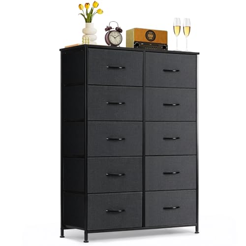 10-Drawer Dresser for Bedroom, Anti-Tip Tall Storage Organizer Chest of Drawers with Wooden Top and Metal Frame Fabric Bins for Closet, Living Room, Hallway, Entryway, Black