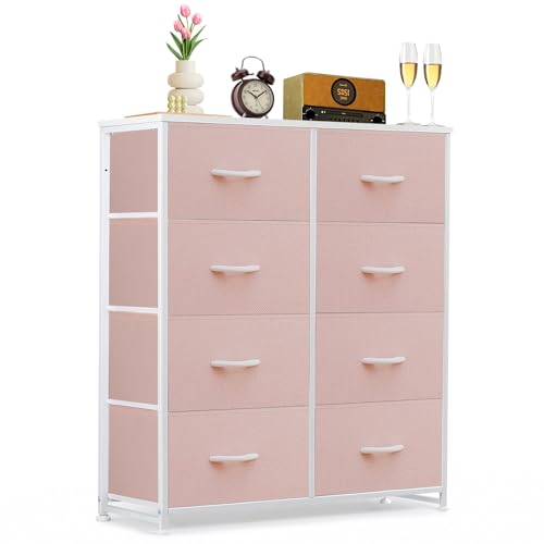 8-Drawer Dresser for Bedroom, Anti-Tip Tall Storage Organizer Chest of Drawers with Wooden Top and Metal Frame Fabric Bins for Closet, Living Room, Hallway, Entryway, Pink