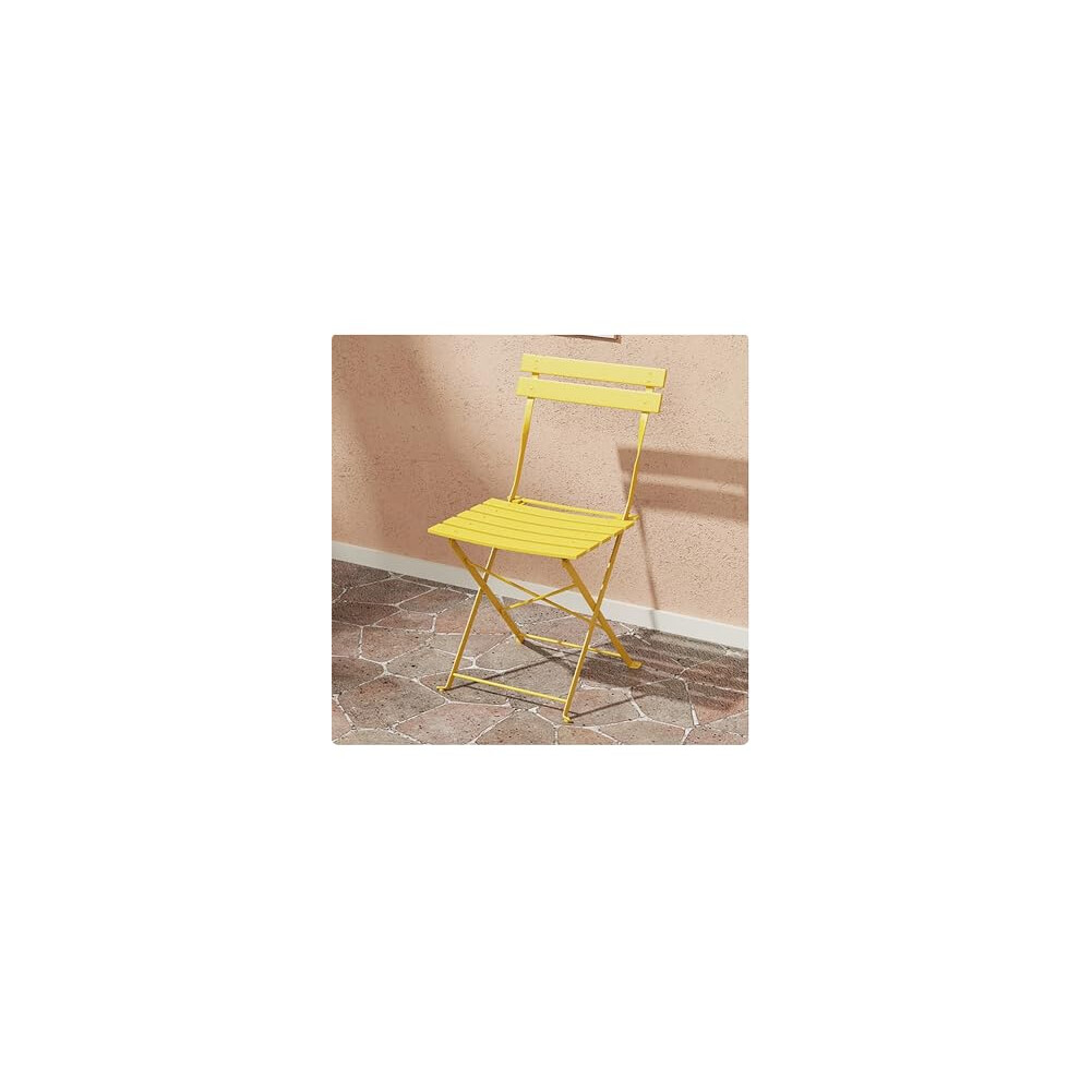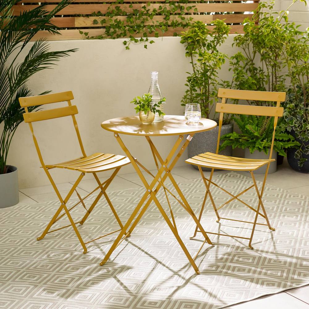 Furniturebox UK Outdoor Furniture, Cabo 2 Seat Mustard Yellow Metal Garden Bistro Set, Round Table & 2 Folding Chairs, Weather Resistant, For Small Garden, Patio Decks or Balcony