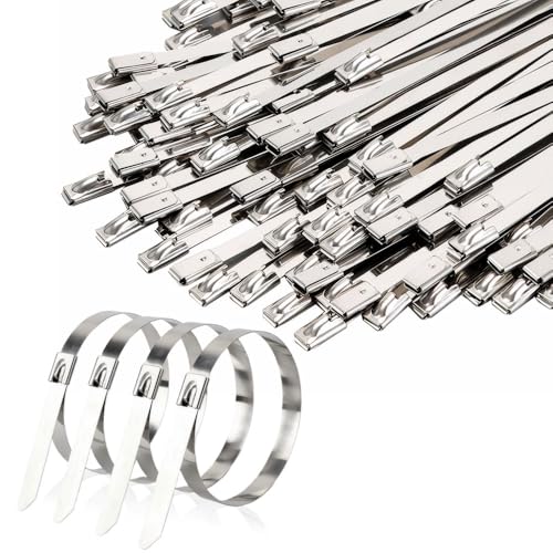 SHOWY SKY 100 Pcs Metal Cable Ties, 304 Stainless Steel Zip Ties Heavy Duty 4.6x300mm 270LB Rustproof Metal Tie Wraps for Bundling, Gardening, Exhaust Repair, Outdoor