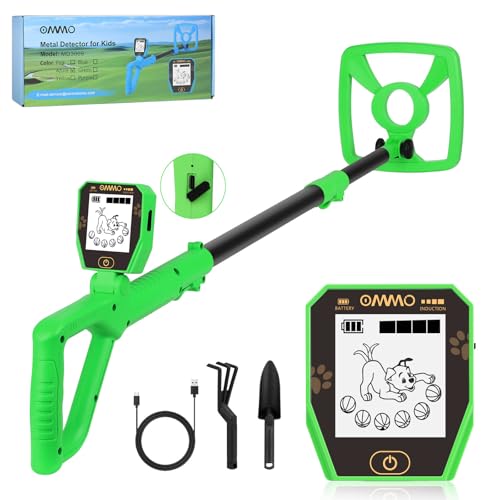 OMMO Metal Detector Kids, Adjustable Stem18.3''-37.8'' Metal Detector with LCD Display, Lightweight Kids Metal Detectors with 6'' Waterproof Coil, Gold detector for Beginners, Shovel, Rake, Green